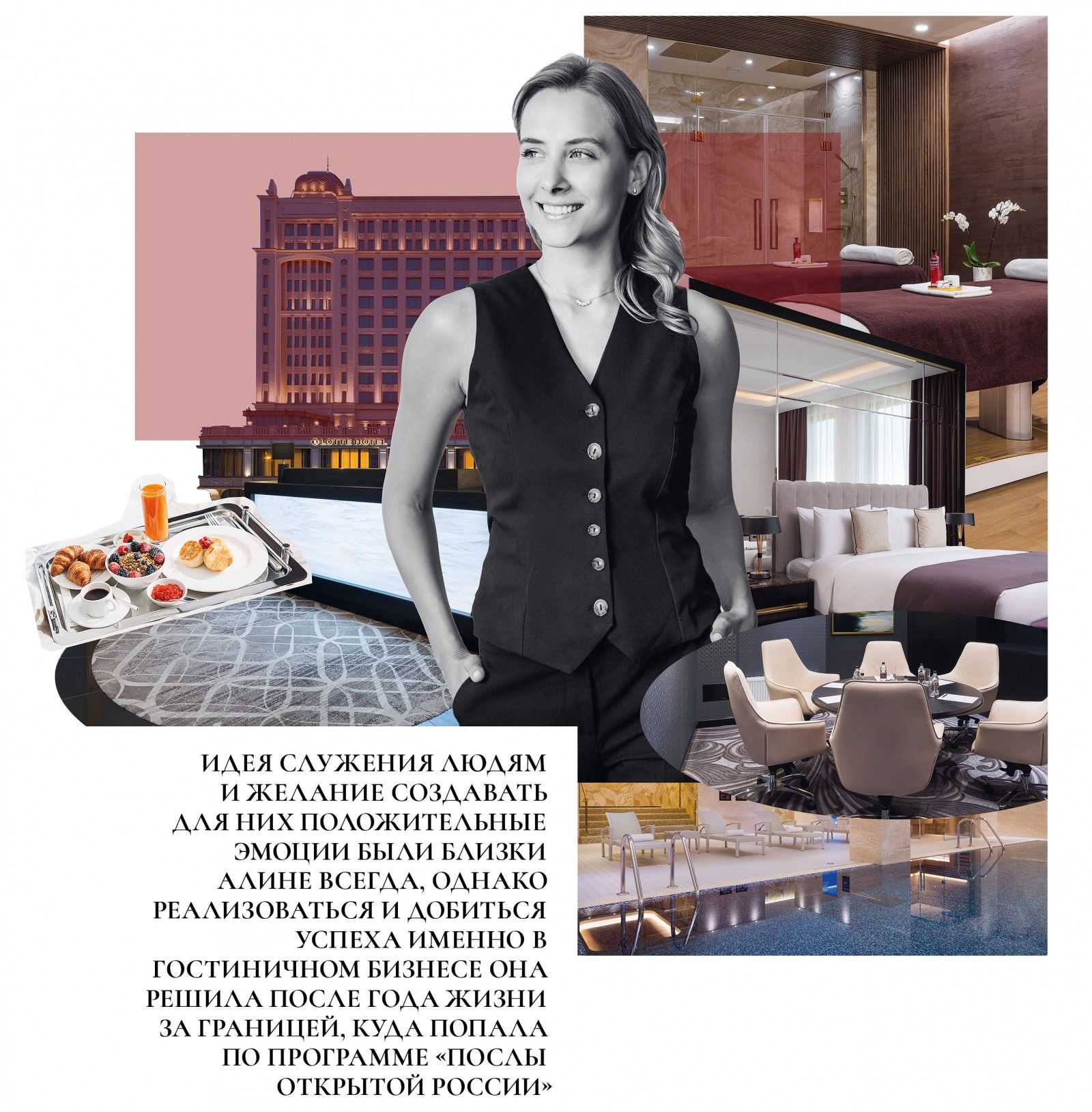 Идея служения людям и желание создавать для них положительные эмоции были близки Алине всегда, однако реализоваться и добиться успеха именно в гостиничном бизнесе она решила после года жизни в США, куда попала по программе «Послы открытой России». Этот опыт кардинально изменил ее представление о работе с людьми. Вернувшись в Россию, она осознала, что хочет работать в сфере, где такие ценности, как дружелюбие, открытость, искренняя забота о другом человеке, – основа всего. С тех пор Алина уже 15 лет работает в этой сфере.