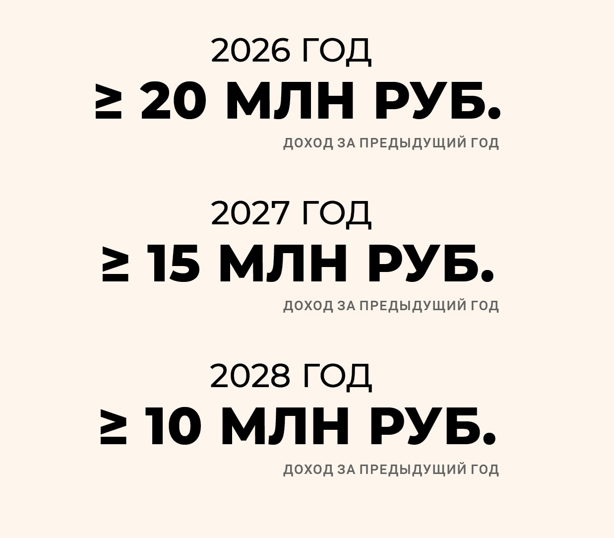 - Доход: до 60 млн рублей в год (за 2025 год, чтобы перейти в 2026-м)