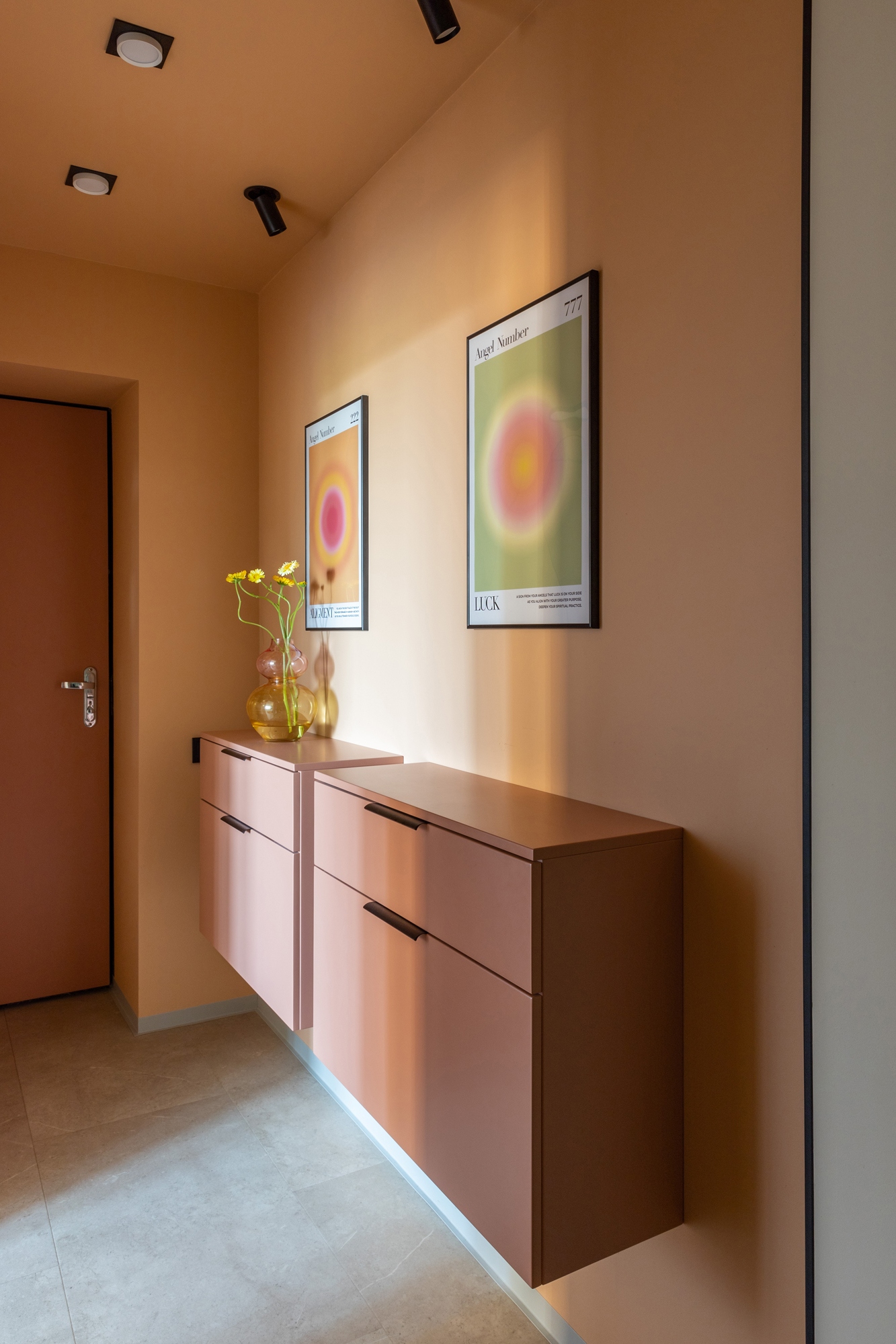 Прихожую мы организовали как единый теплый объем на контрасте с более холодными оттенками остальной части квартиры. За счет цвета мне удалось отделить зону прихожей от длинного коридора. Теплые оттенки еще появляются в детской, но в остальном, квартира решена в прохладных мятных цветах. На полах во всей квартире мы применили единое покрытие - кварцвинил под бетон тепло-серого цвета. Кухню мы разместили углом, кухонную мойку вывели к окну. В подоконник встроили теплый пол и для надежности повесили вертикальный радиатор. От заказчиков был запрос расположить диван на кухне, чтобы было комфортно смотреть телевизор, но на небольшой площади этого сделать не удалось. Тогда мы заменили диван длинной мягкой кушеткой, расположившейся вдоль всей стены. Кушетку изготовили на заказ, она состоит из трех открывающихся модулей, которые являются дополнительным местом для хранения вещей. Кухню обыграли в тех же мятных, розовых и тепло-серых оттенках, что и остальные помещения, остановив выбор на краске San Marco, которую использовали на стенах. Я доверяю краскам этого бренда, мне нравится богатая коллекция салона. Продукция San Marco качественная и хорошо показывает себя в эксплуатации долгие годы: влагостойкая, отлично моется и радует цветом.