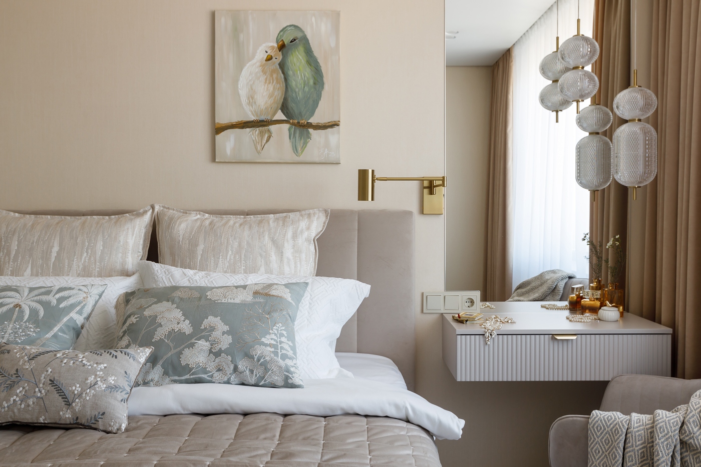 Интерьер одушевляют вещи, несущие тепло человеческих рук. В этом проекте связующей нитью стал растительный орнамент. Он начался в рисунке премиального ковра из эвкалиптового шелка в гостиной, плавно перешел на вышивку шелковых подушек в спальне и нашел выражение в авторской картине над изголовьем кровати, которую я написала специально для проекта в подарок заказчикам.