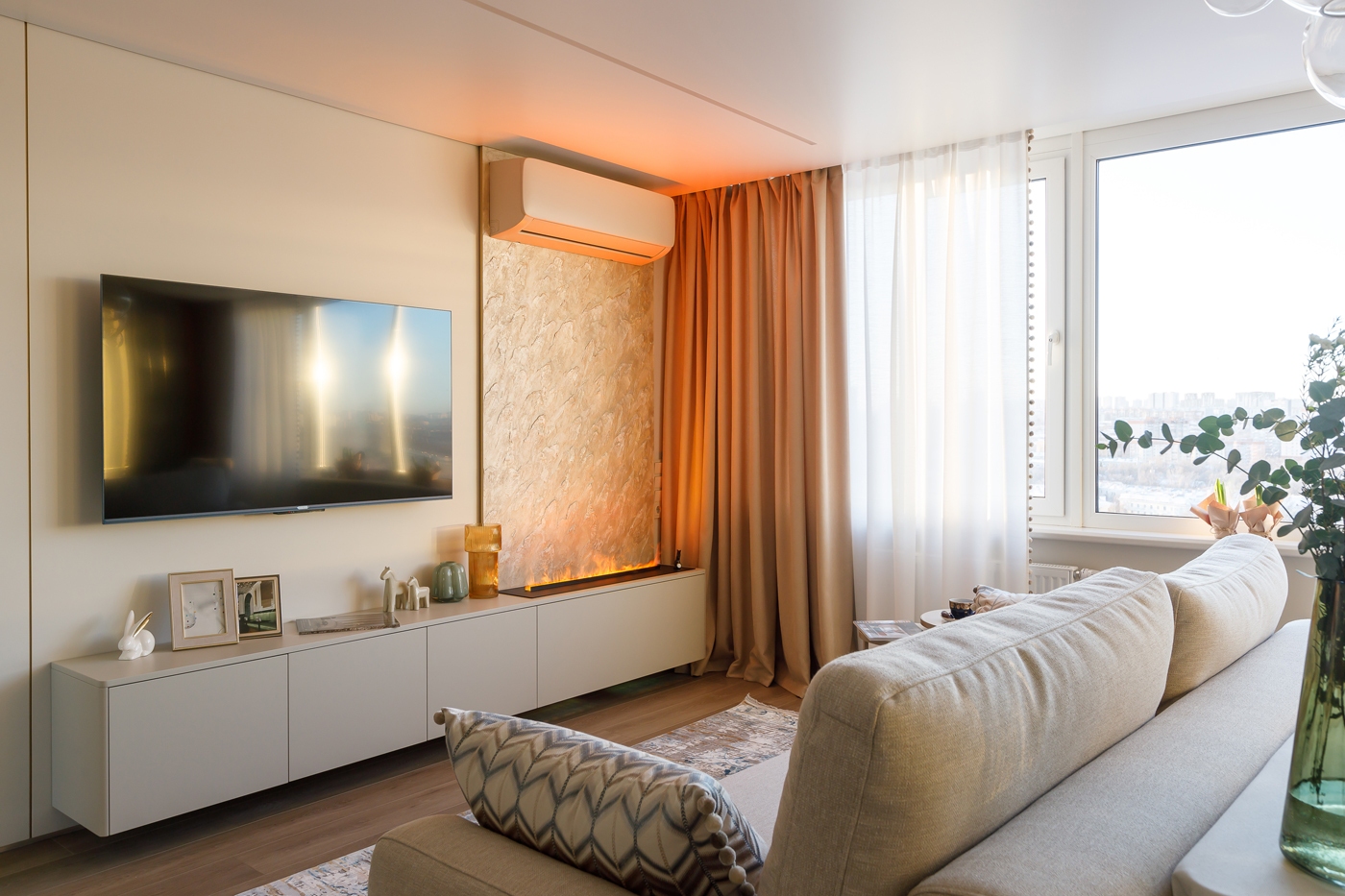 Желая наполнить вечера особой атмосферой, я интегрировала электрический камин с функцией увлажнения воздуха, чье пламя живописно бликует на декоративной штукатурке Cavenier. В процессе работы над фактурой стен мы создали настолько художественные образцы, что решили не расставаться с ними, а облачить в золотые рамы, превратив рабочие материалы в уникальные арт-объекты.