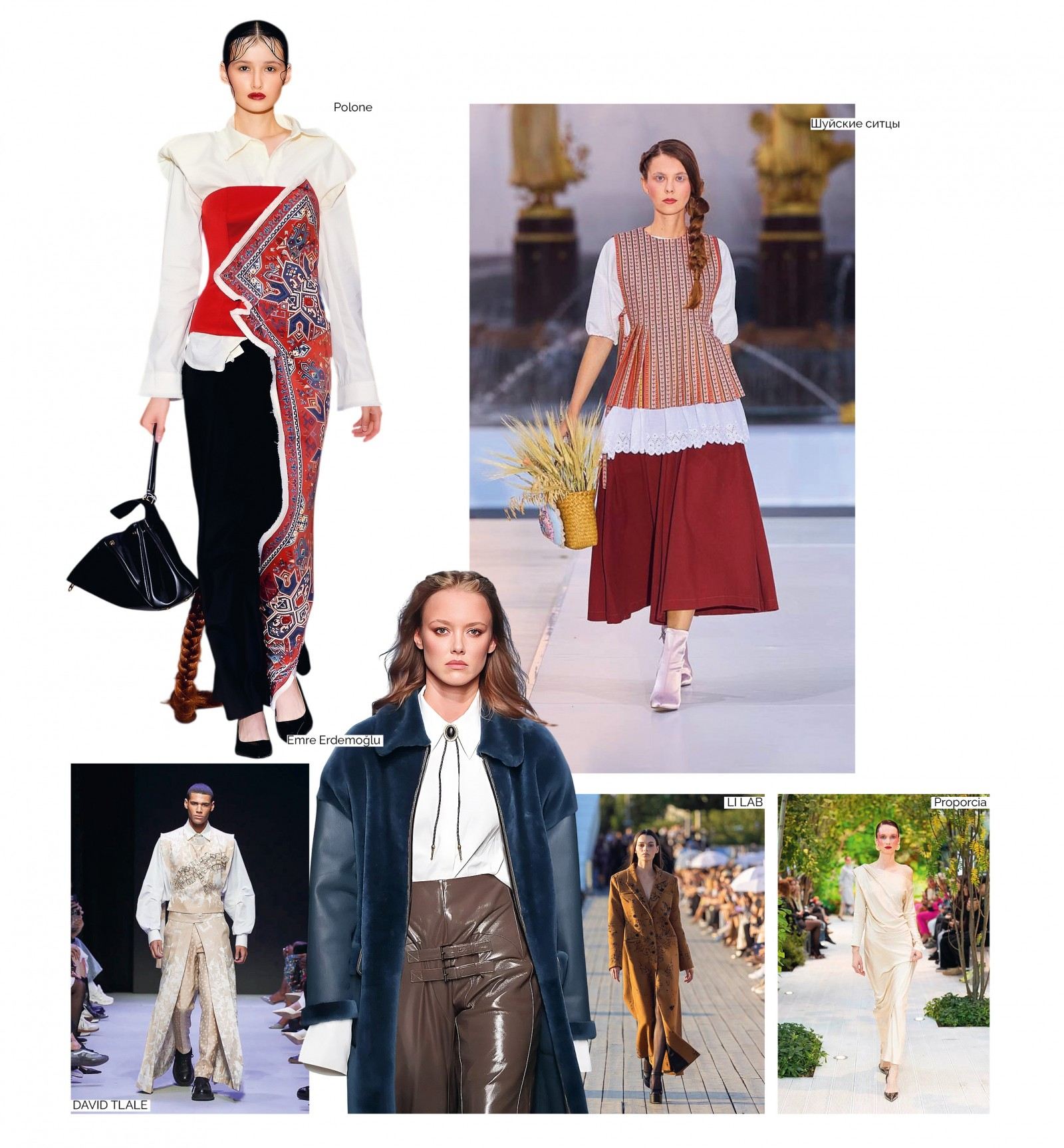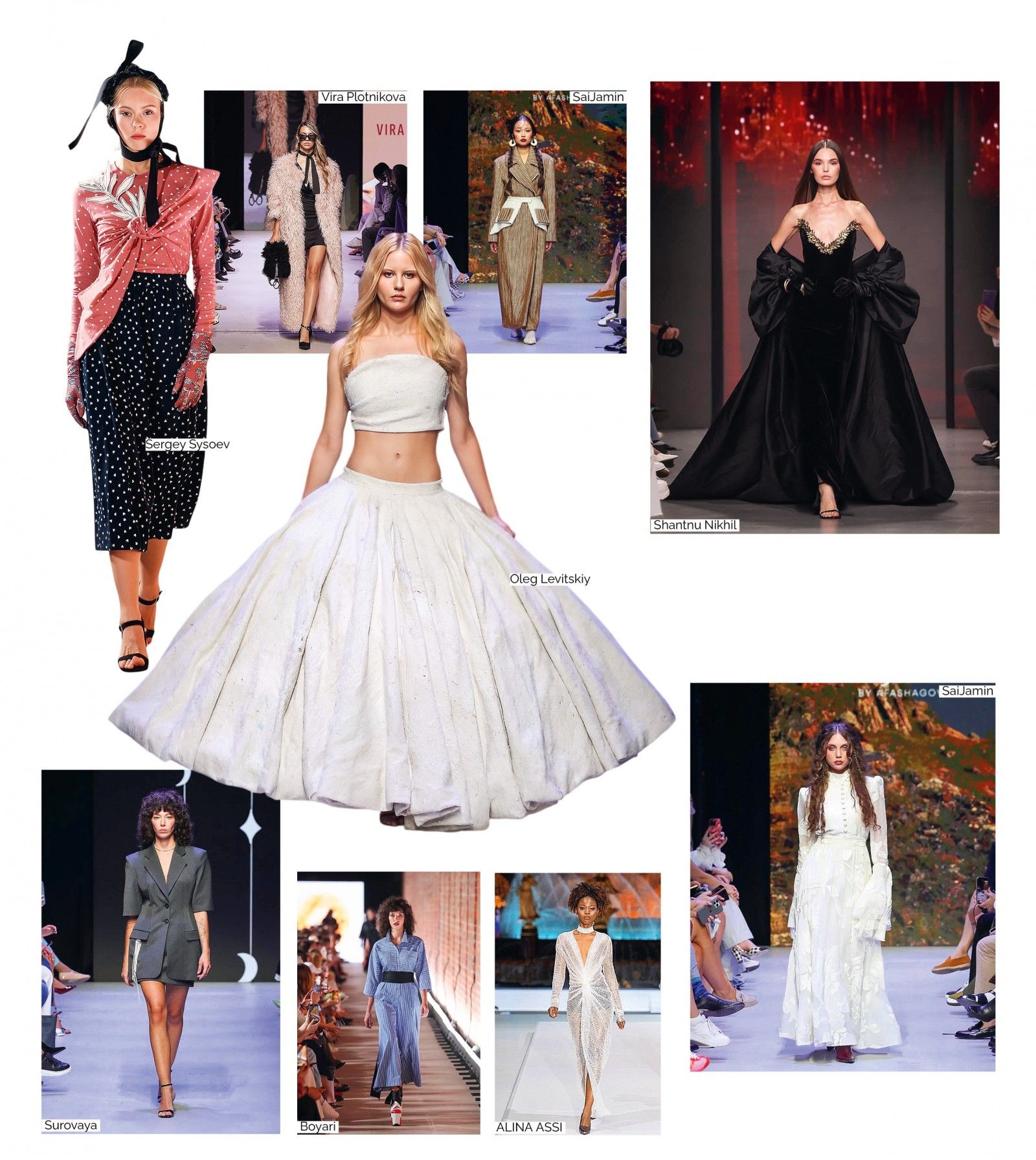 Благородные шелка и роскошные меха, брутальная кожа и балетные пачки, сверкающие пайетки и изящное кружево, ситец, вязаные свитера, пластмассовые лейки, авоськи, галоши на валенки...Тема патриотизма звучала лейтмотивом во многих коллекциях соотечественников.