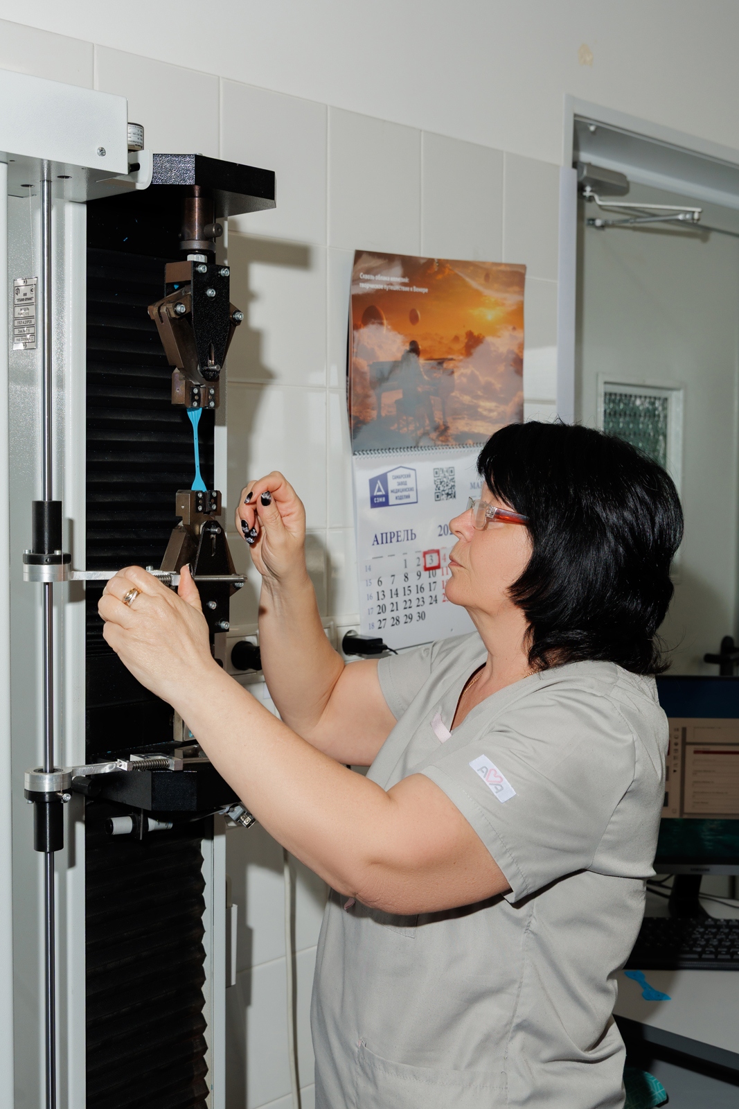 Один из ключевых этапов проверки – растяжимость перчаток по ГОСТу. Из изделия вырезают специальный образец – так называемую «лопатку». Его закрепляют в держателях разрывной машины, после чего механизм начинает растягивать материал. Результаты испытания автоматически выводятся на экран. По нормативам растяжимость перчатки до старения должна быть не менее 500%, после старения – не менее 400%. На самарском заводе показатели значительно выше: около 700% до старения и порядка 500% – после. Помимо механических испытаний специалисты внимательно оценивают вид продукции: форму перчаток, наличие возможных дефектов, герметичность упаковки и корректность маркировки.