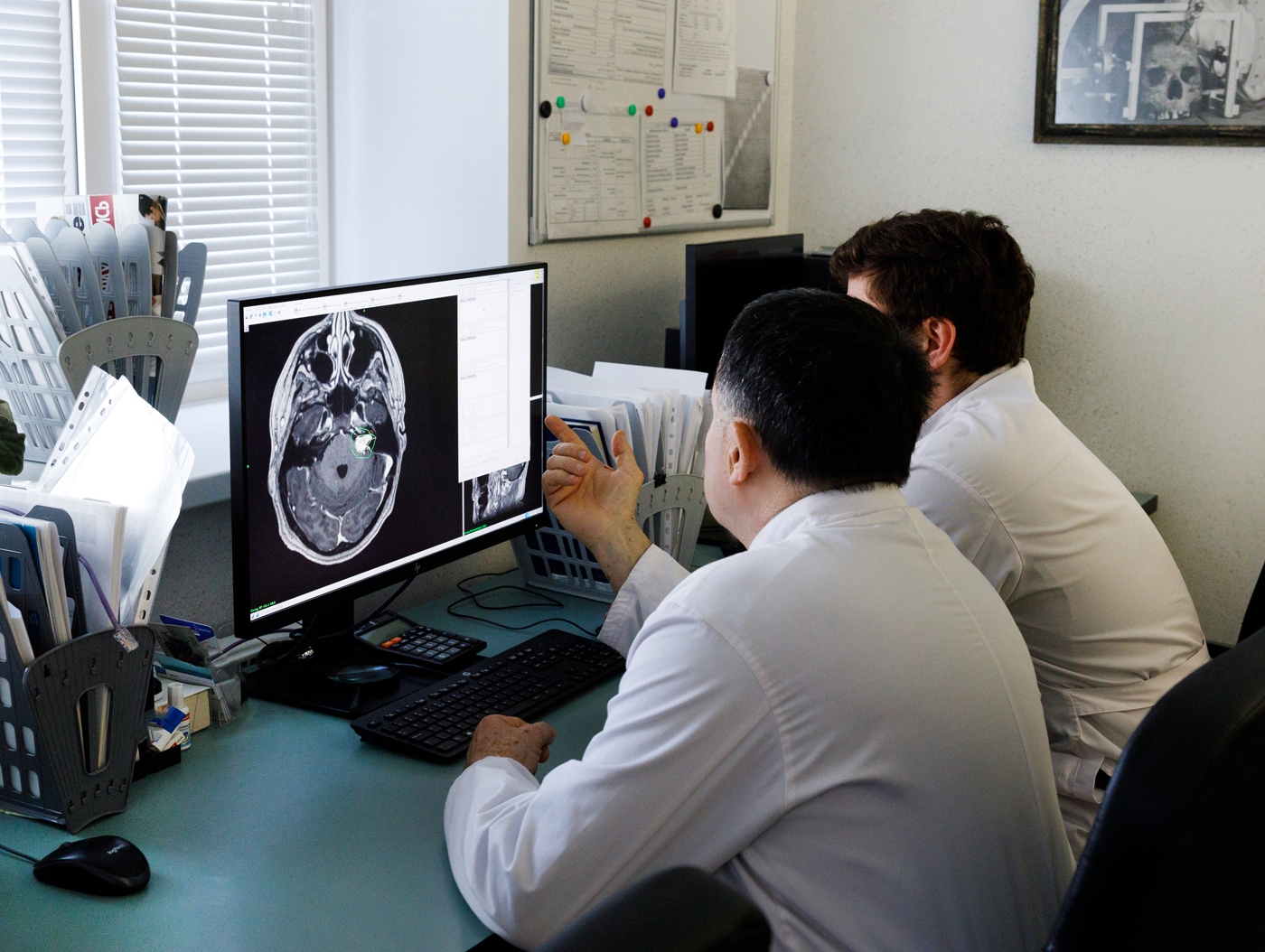 Продолжительность процедуры зависит от конкретного заболевания, размера образования и сложности случая. Иногда лечение занимает около 15–20 минут, а иногда может продолжаться несколько часов. Решение о проведении радиохирургии никогда не принимается одним специалистом — всегда работает команда. «В обсуждении участвуют нейрохирурги, радиотерапевты и медицинские физики. Именно медицинский физик рассчитывает точную дозу излучения и параметры воздействия для каждого конкретного пациента», – рассказывает о процедуре заведующая отделением Юлия Сергеевна Пышкина.