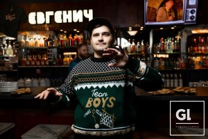 «Евгенич» с порога встречает гостей знакомым визуалом эпохи: плакаты и вывески в духе 90-х, ковры на стенах, музыка того времени и в особенности хиты «Руки Вверх», аппараты с лимонадами, бутерброды со шпротами и селедкой, хрустящие чебуреки. Интерьер намеренно лишен пафоса — он пестрый, немного наивный, домашний и очень живой. Работники бара, ведущие и сам Сергей Жуков поддержали концепцию и появились в образах, отсылающих к стилю десятилетия, а гости знакомились и общались между собой, танцевали, делились впечатлениями и воспоминаниями.