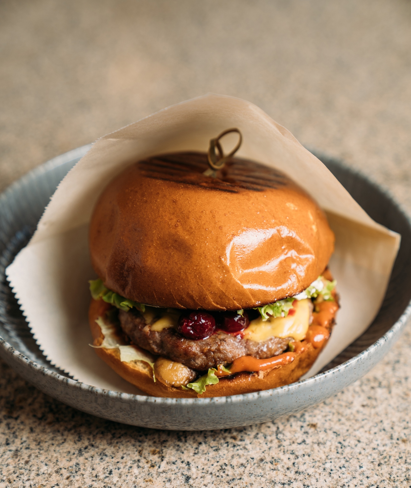 Еще одно из самых любимых сытных блюд кондитерской. Вкусная котлета, много сыра, грибы, бекон, необычный соус из острой вишни – кутюр мира бургеров.