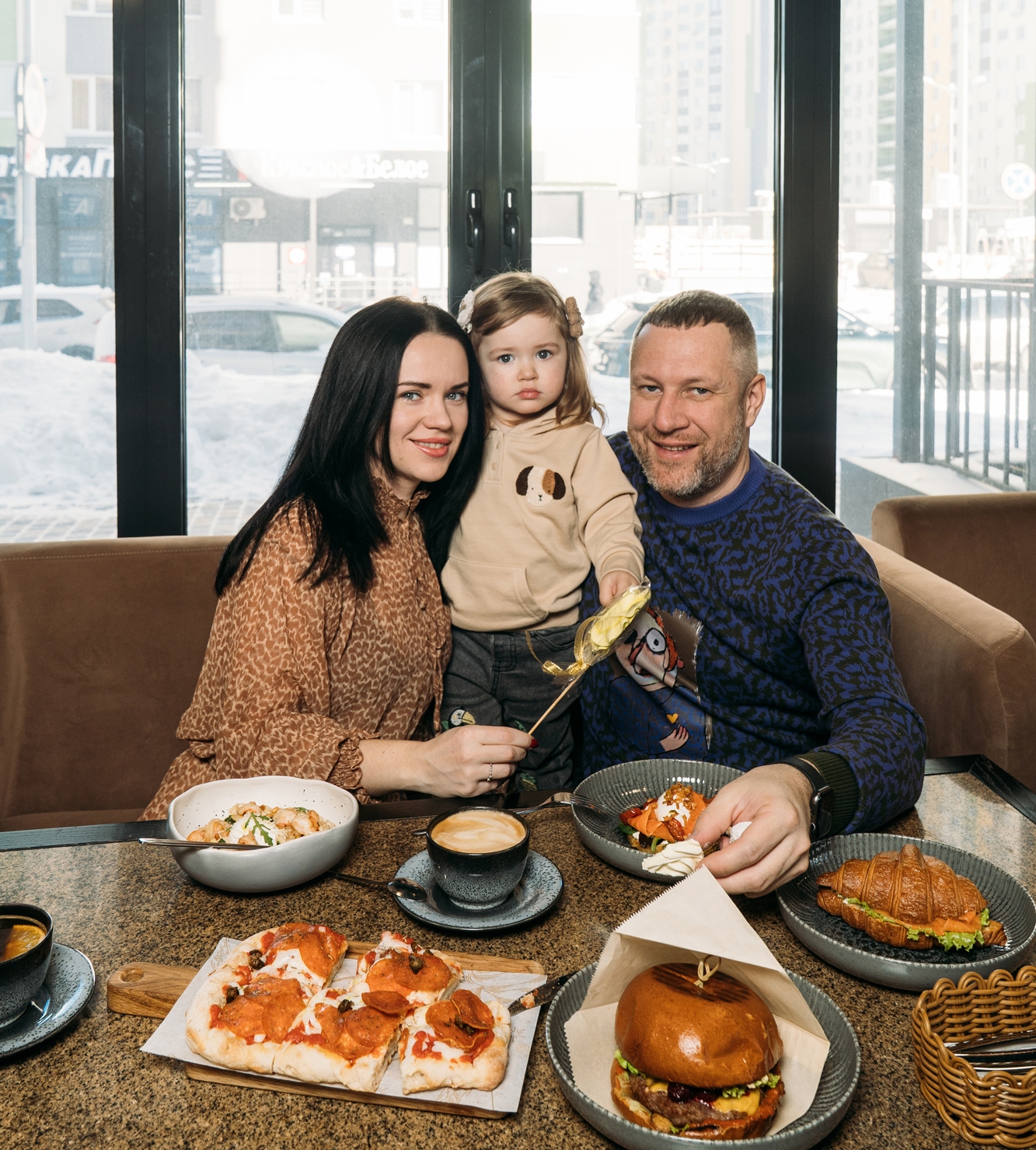Алина Сержантова, Александр Рухлов и дочь Ева в кондитерской «Прага»