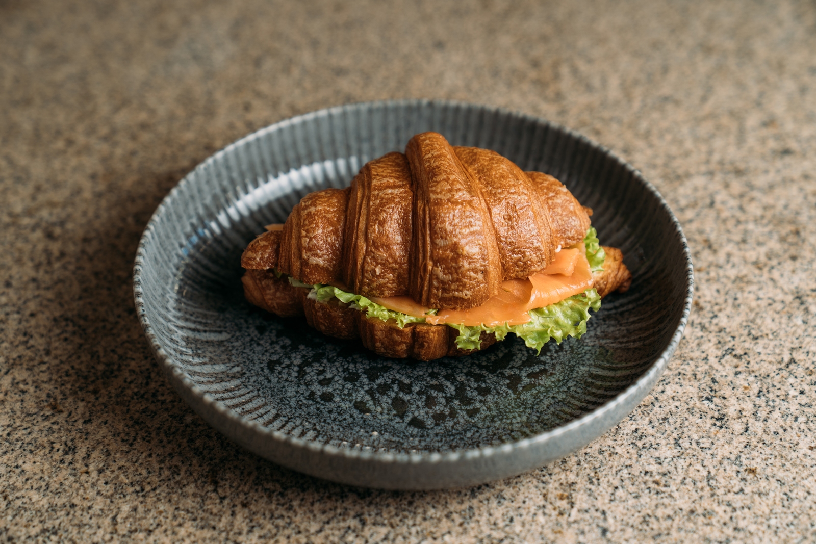 Круассан с норвежской семгой, зеленью, сливочным сыром и яйцом пашот