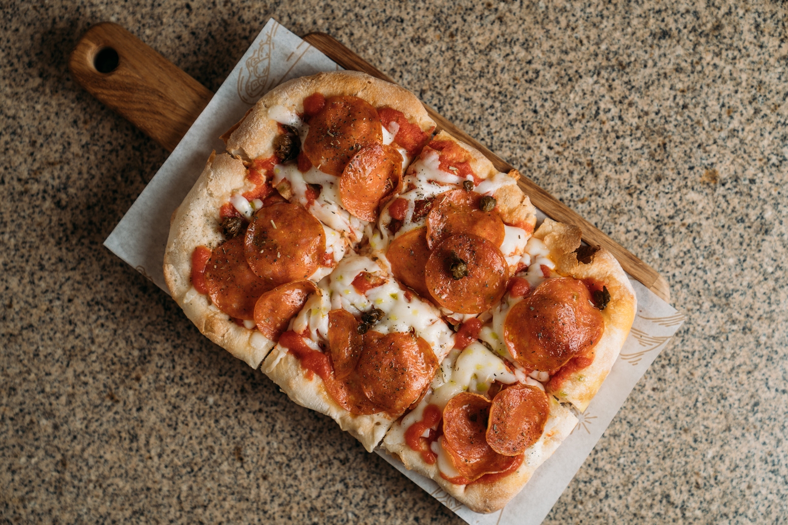 Самая классическая и популярная пицца в мире в комфортном небольшом формате кондитерской «Прага», чтобы вдвоем или даже в одиночку насладиться острой колбаской на подушке воздушного теста с сыром. Это умопомрачительно.