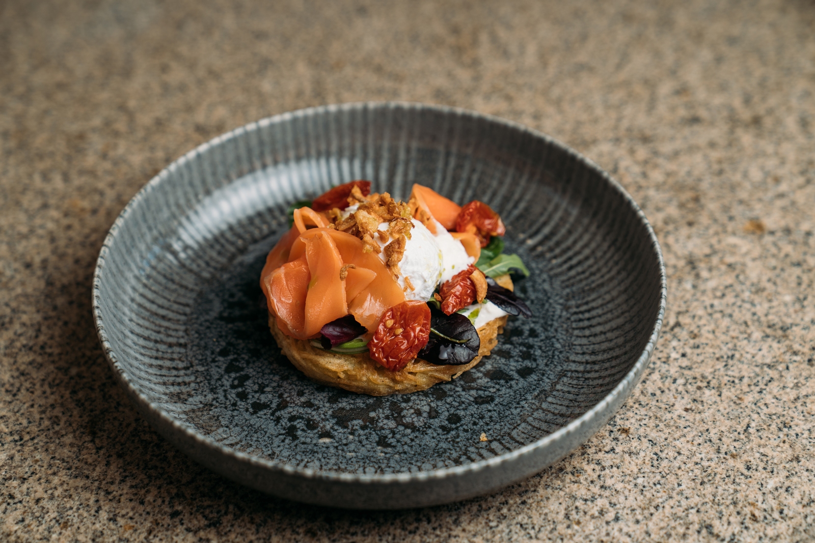 Картофельный драник с семгой, страчателлой и яйцом пашот