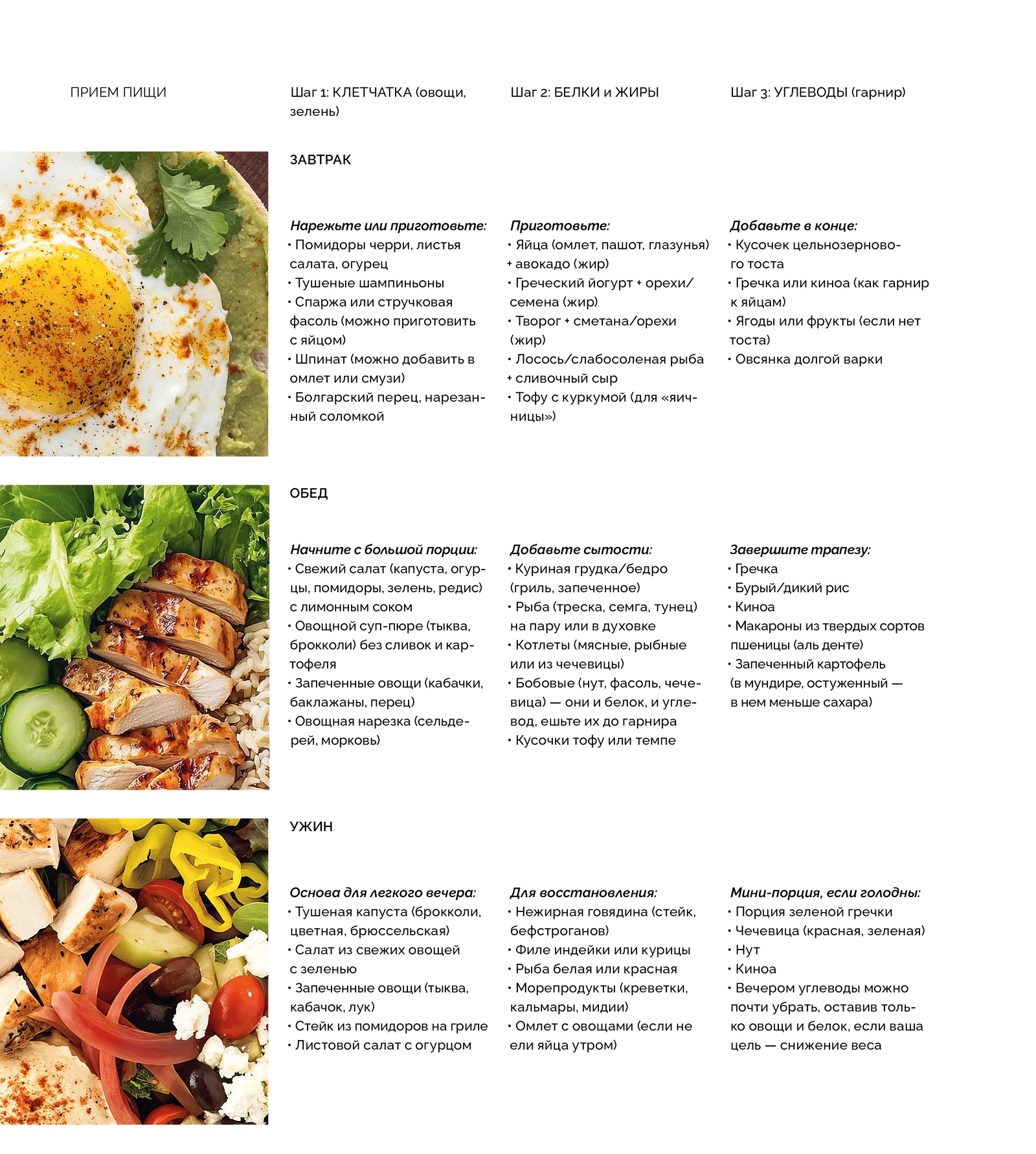 Вот подробный конструктор для завтрака, обеда и ужина. Выбирайте по одному продукту (или сочетанию) из каждой колонки для вашего приема пищи и ешьте их в правильном порядке: КЛЕТЧАТКА -> БЕЛКИ/ЖИРЫ -> УГЛЕВОДЫ.