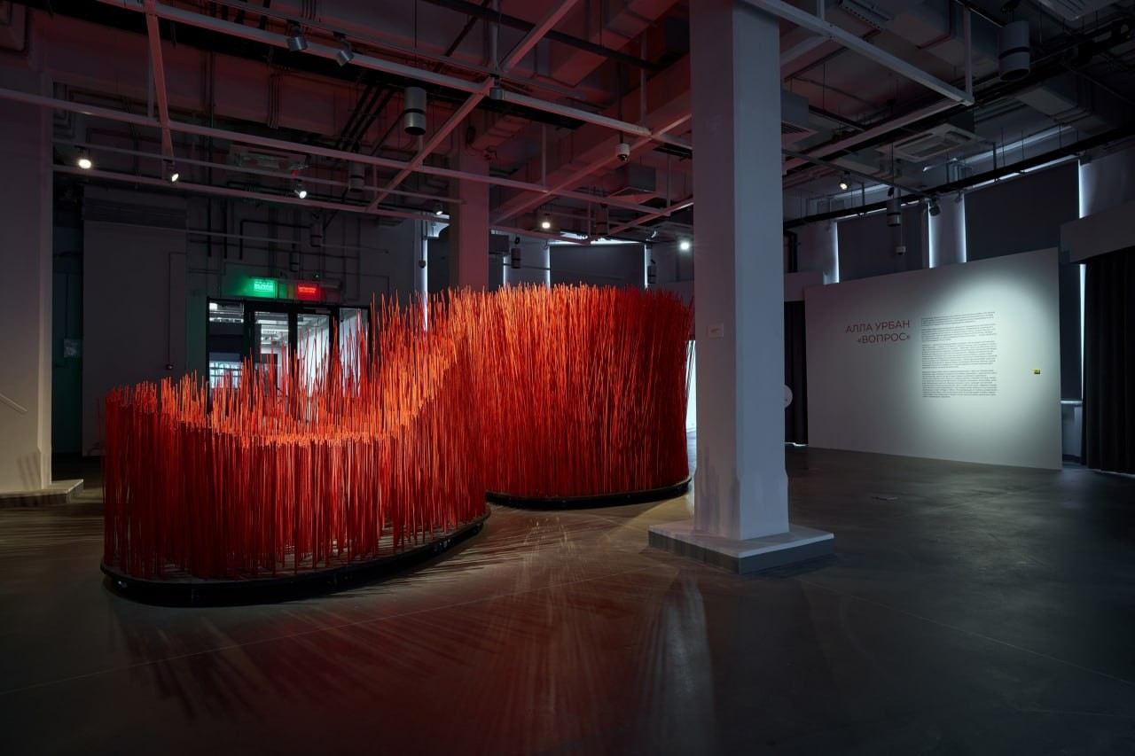 Экспозиция завершается инсталляцией Аллы Урбан под названием «Вопрос», созданной художницей в 2018-2019 годах. Тонкая ручная работа: твердые стержни выстроены так, чтобы образовать отпечаток пальца художницы. В работе были использованы два материала: металлические стержни и невесомая красная нить. При обвитии и натягивании нити Алла Урбан обнаружила, что от постоянного трения её собственный отпечаток пальца стирается, оставаясь на красной нити, похожей на капиллярные линии. В дальнейшем эта работа стала механизированной. В инсталляции каждый материал обретает самоценность, а горячий физиологический красный цвет уравновешивает металлический холод железных стержней.