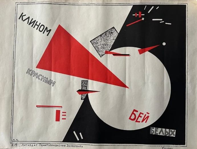 Эль Лисицкий воплотил супрематические идеи в революционных плакатах. Его знаменитый «Красным клином бей белых» превратил простые формы в мощный политический символ. Красный клин здесь - не просто цвет, а воплощение силы и нового миропорядка. Как отмечал Кандинский, напряжение между треугольником и кругом в этой работе сравнимо с касанием Бога и Адама в Сикстинской капелле.