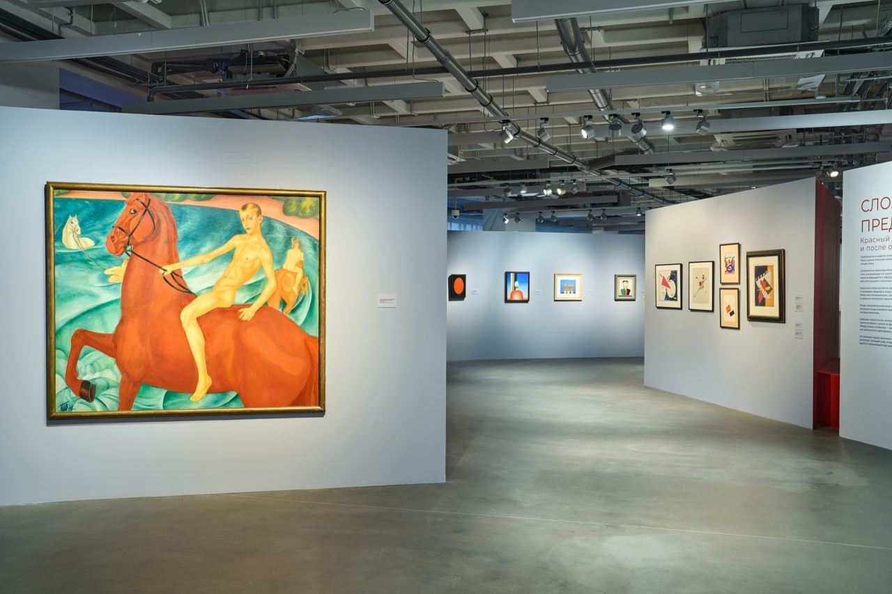 Настоящая прима выставки — «Купание красного коня» принадлежит кисти хвалынского художника Кузьмы Петрова-Водкина. Эта картина выступает смыслообразующим центром экспозиции, и, по словам представителей музея, именно с этого знаменитого полотна и начала складываться вся выставка. «Купание красного коня» является эпиграфом экспозиции, соединяя разделы «Энергия материи. Красный в историческом авангарде 1910-х» и «Сложные предчувствия».