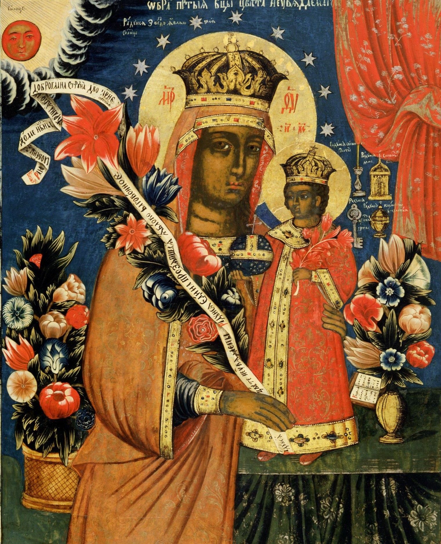 Для произведений Натальи Гончаровой характерна нарочитая грубоватость. В своих картинах по религиозным сюжетам художница изображает образы архангелов, Богоматери, апостолов и евангелистов. Триптих написан экспрессивно и контрастно. По бокам от фигур Богоматери и Младенца Наталья Гончарова изображает райские цветы красного цвета. Рядом с триптихом выставлена одна из самых почитаемых икон - «Богоматерь «Неувядаемый цвет» XVIII века. Ранее священники использовали её при проведении таинства венчания. В этой картине красный цвет олицетворяет вечную любовь и нетленную красоту, а также служит источником божественного света и тепла.