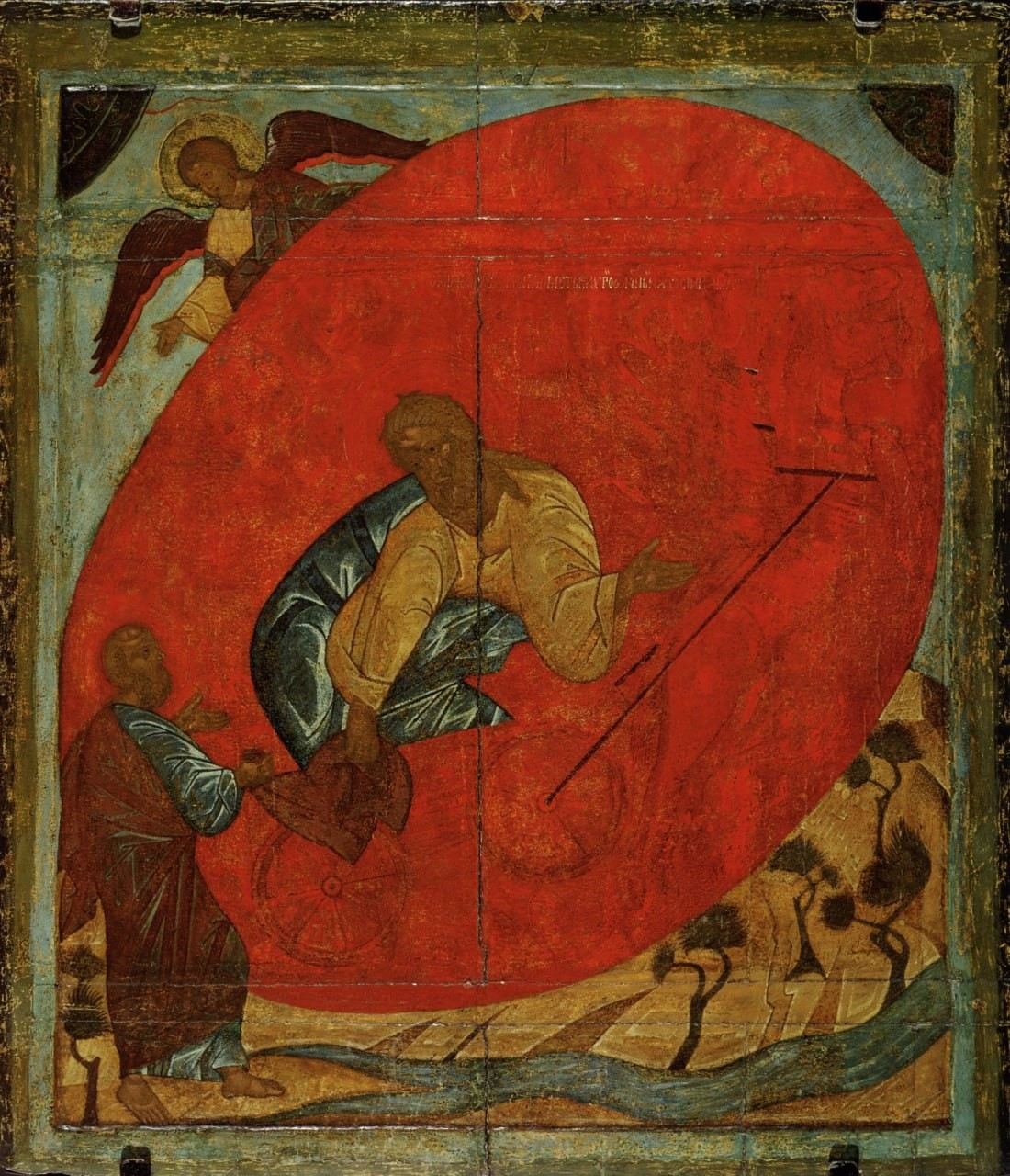 Центральный экспонат - икона XVI века «Огненное восхождение пророка Илии». В ней традиционный библейский сюжет обретает особую выразительность: три красных коня несут пророка в огненном вихре, изображённом как алое солнце. Ангел слева символизирует божественную силу, поднимающую колесницу. Этот яркий образ стал визуальной метафорой революционных преобразований, соединяя древнюю иконописную традицию с тревожными предчувствиями новой эпохи.