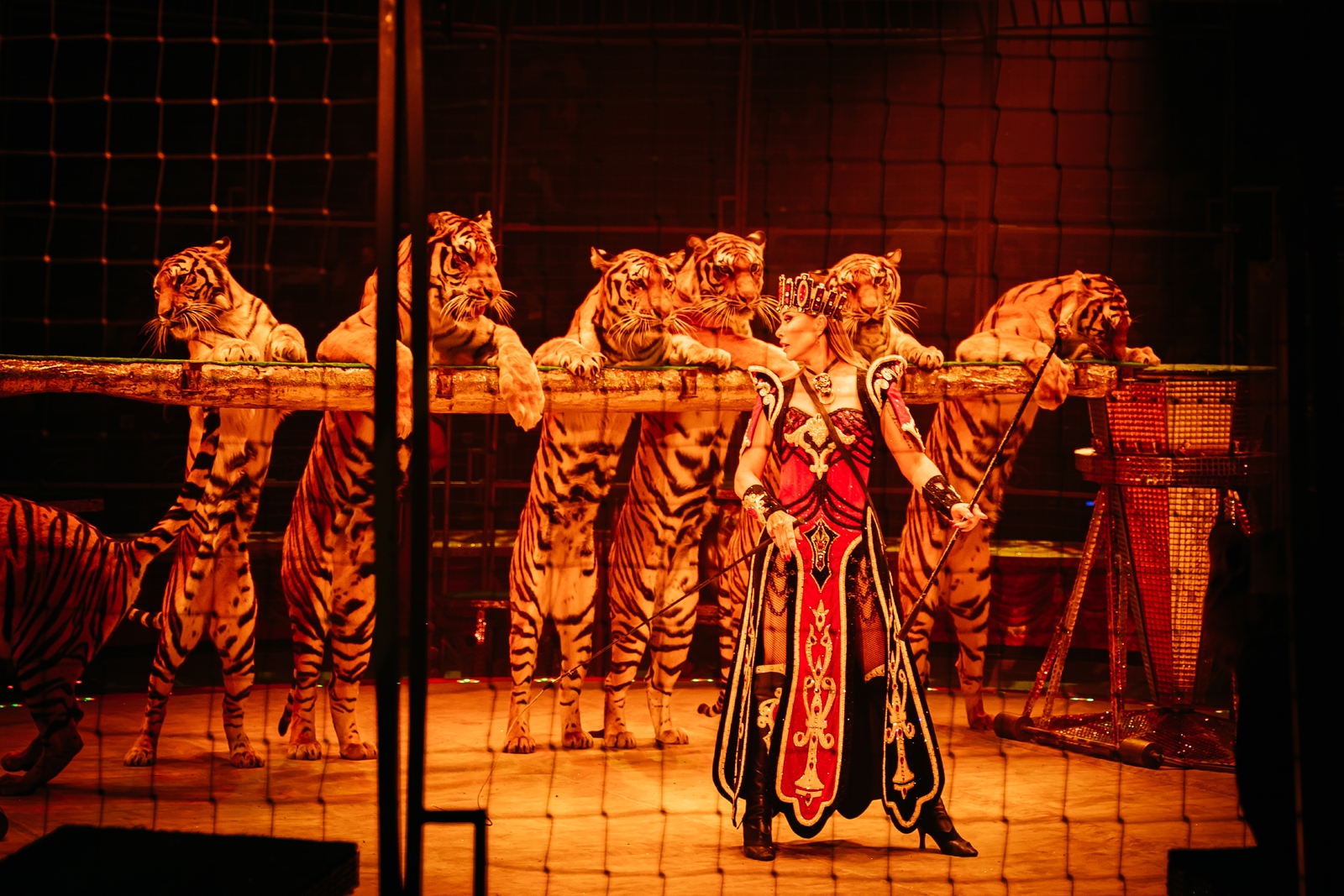 Изюминкой шоу стал масштабный аттракцион с 9-ю хищниками – «Дикий мир» под руководством обладательницы международного титула «Принцесса цирка», Заслуженной артистки России Людмилы Сурковой.