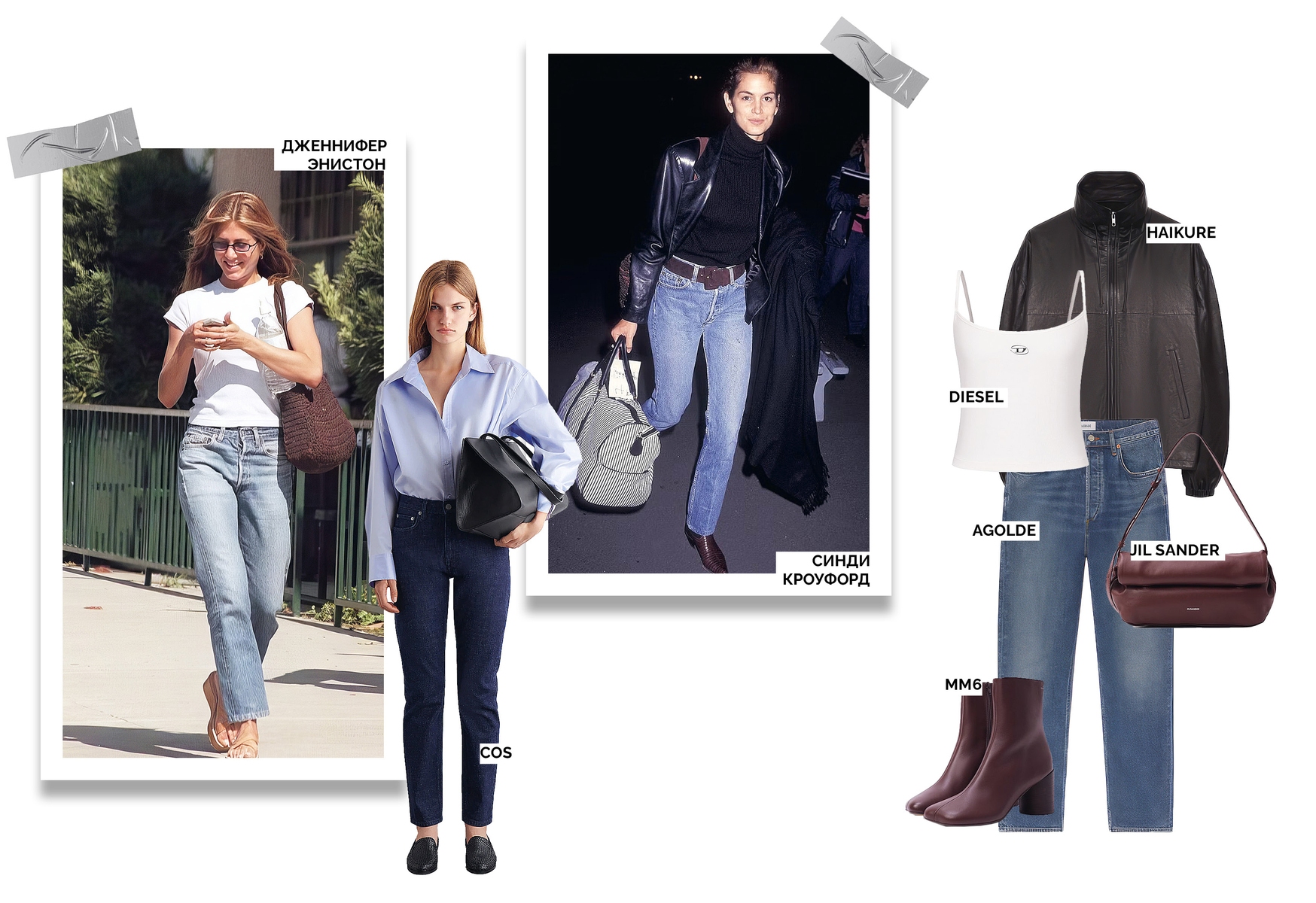 Самые популярные образы 90-х – да, эта эпоха до сих пор с нами и продолжает вдохновлять – невозможно представить без прямых синих джинсов-«сигареток» в сочетании с низким каблуком (в идеале — на массивном каблуке и с квадратным носком). Этот минималистичный тандем был любим многими актерами и моделями той эпохи (например, стали культовыми образы Синди Кроуфорд в аэропорту, Дженнифер Энистон и Кортни Кокс, когда они не были на красной дорожке, рекламируя сериал «Друзья»; Вайноны Райдер, если она не была в строгом костюме или шелковом платье). Действительно, хотя у всех них был свой стиль и подход, джинсы-сигареты и низкие каблуки были своего рода униформой для инфлюэнсеров 90-х.